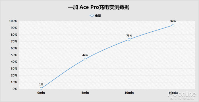 充电方面,实测,一加AcePro从1%的电量开始测起,2分钟可以充至24%,5分钟可以充至44%,最终用时17分钟32秒,前台显示电量已到100%。可以看出,一加AcePro在50%电量以下时,5分钟内就能充入一个比较可观的电量,可充分利用上日常的碎片化时间进行充电。