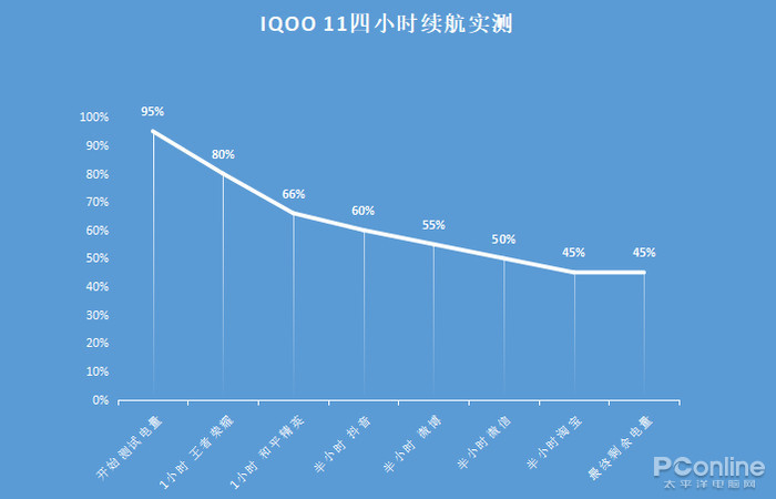 有闪电快充,硬核续航当然也要有!iQOO11的续航也是完全对得上“电竞传说”的称号,以下的实测续航数据完全不惧重度使用。