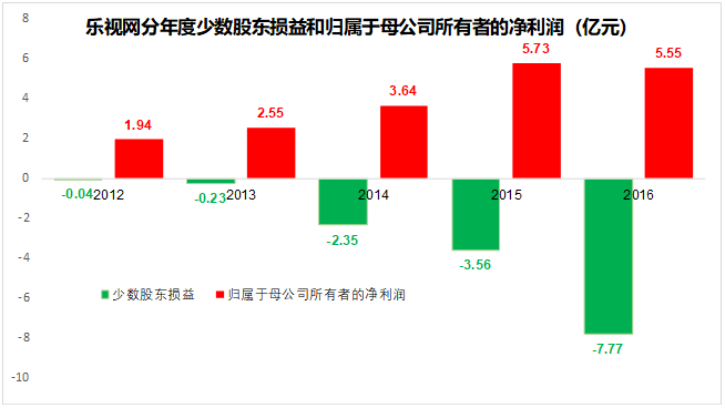 典型的例子是已经退市的乐视网,从2012到2016年,乐视网归属于母公司所有者的净利润都是正的,但少数股东损益则全部为负,尤其是2016年,少数股东权益所亏损的数值已经大于归属于母公司所有者的净利润数值,公司经营业务从整体上说,已经处于亏损状态了。