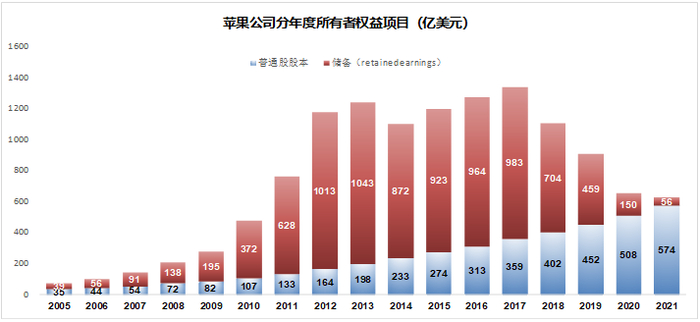 原因就是苹果对股东的慷慨回报。苹果在二级市场上不断回购自己的股票并注销,这部分成本在财务上对应的就是冲减留存收益。所以苹果的留存收益部分才是王小二过年—一年不如一年。当然苹果还算克制,很多美国上市公司慷慨到所有者权益这个都能成负数,比如麦当劳。