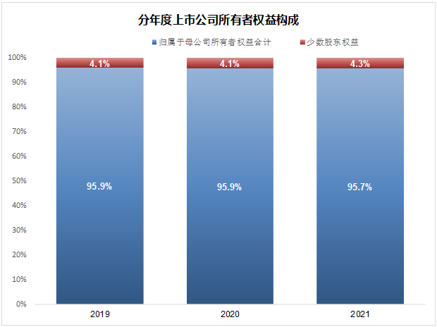 我们在上述4492家上市公司数据库的基础上,又剔除了一些奇异值,得到了总共4327家上市公司的数据库。从数据看,全部上市公司所有者权益中,归属于母公司所有者权益占绝对的大头,96%左右,少数股东权益一般是4%出头。