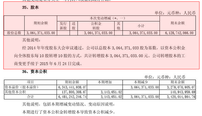 上图是伊利股份2015年10转增10的中报附注。伊利股份从资本公积-资本溢价(股本溢价)科目中划出了30.64亿,转到了股本项下,从而完成了这次10转10的会计操作,由此伊利股份的实收资本(或股本)也实现了翻倍。