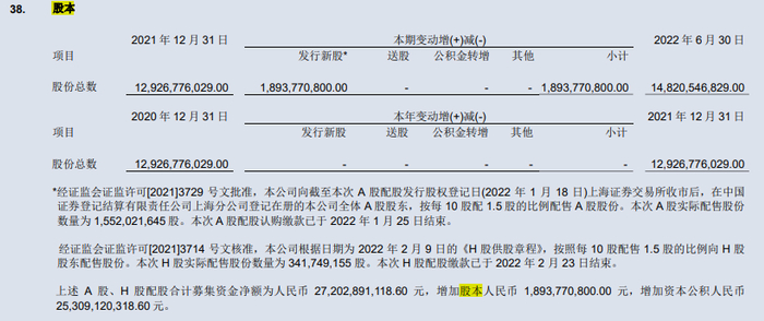 配股的处理方法跟定增基本一致,上图是中信证券2022年中报附注。中信证券10股配1.5股,股本增加了18.94亿,剩下的募集资金增加资本公积253亿元。