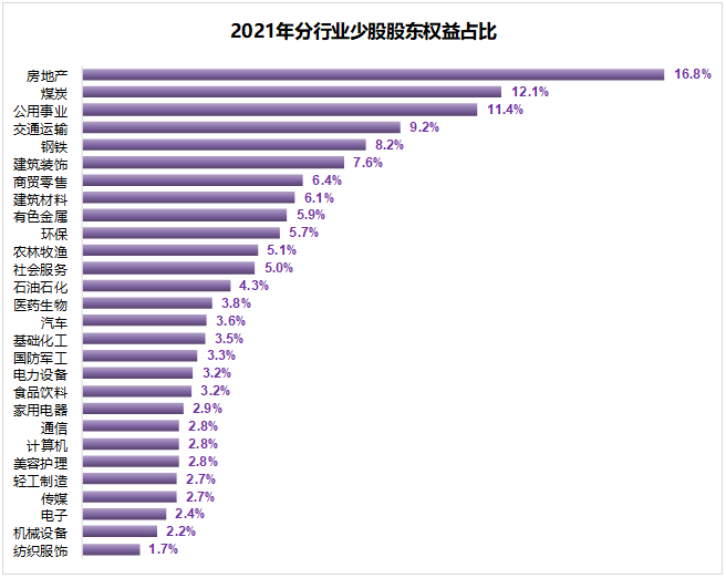 总体上看,少数股东权益在所有者权益中总体占比并不高,但有些行业普遍的比较高,这个时候就不能继续忽略了。从2021年的数据看,少数股东权益占比较高的行业有房地产、煤炭、公用事业、交通运输和钢铁,基本上都是一些资产投入较高的行业。尤其是房地产,占比高达16.8%,远远超过其他行业。