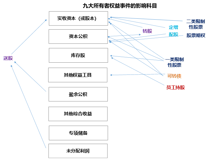 我们研究所有者权益的各个科目,本质上是想预测实控人及管理层的诉求,这些诉求最终的落脚点就是能够影响到实控人管理层行为的各类事件,这其中比较常见的包括转股、送股、定增、配股、一类二类限制性股票、股票期权、可转债、员工持股等九大类。