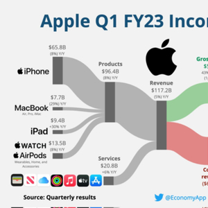 苹果发布2023年第一财季财报,财报显示苹果第一财季按产品划分的话,除服务和iPad以外,所有产品类别的销售额都有所下降。具体来看,苹果第一财季总净销售额为1171.54亿美元,较上年同期下降5%,净利润为299.98亿美元,同比下降13%。其中iPhone业务净销售额为657.75亿美元,较上年同期的716.28亿美元下降8%。