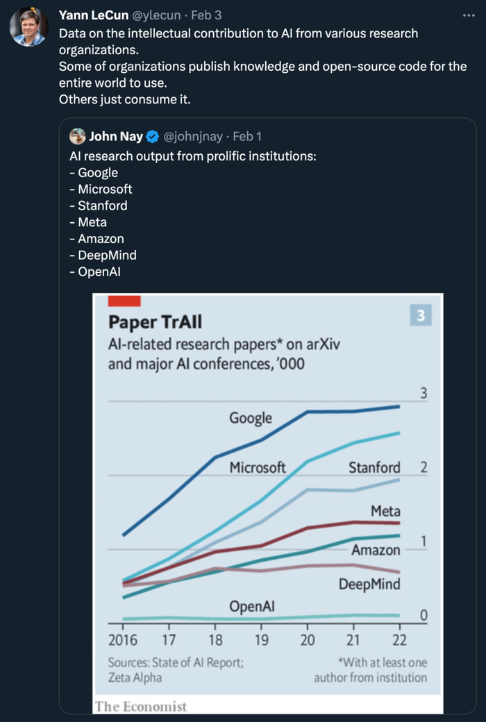 另一家科技巨头 Meta 感受到的情绪似乎有所不同。作为 Meta AI 首席科学家,图灵奖得主 Yann LeCun 最近讨论的主要是「ChatGPT 乃至 OpenAI 这家公司都没有实质创新」的问题: