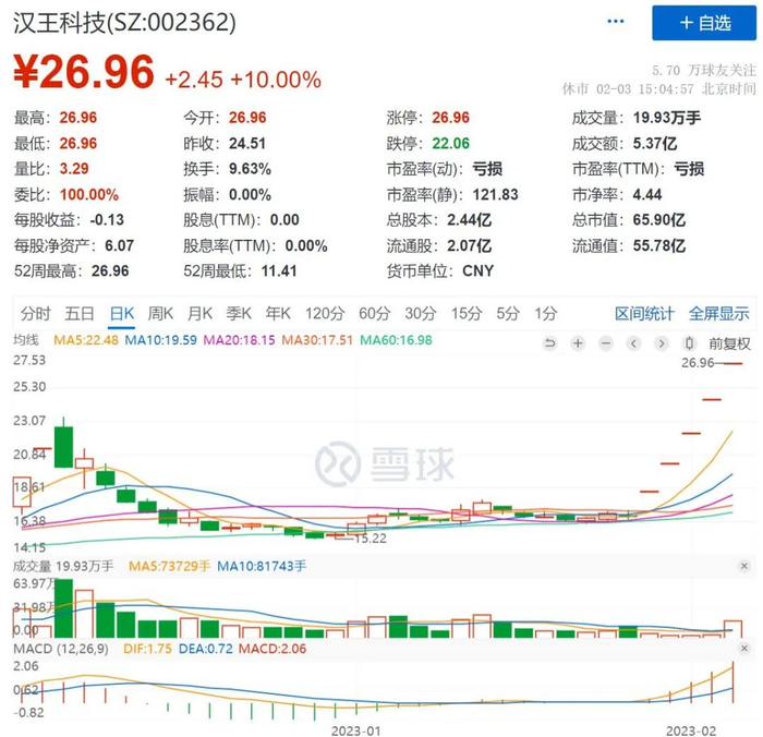 最近,国内虽然还没有类似 ChatGPT 的技术出现,但有因为新技术而疯涨的股票。最近大热的汉王科技已连续收获五个涨停板,连续涨停期间累计涨幅达 61.05%,与此同时云从科技、科大讯飞、科大国创等也有不小涨幅。