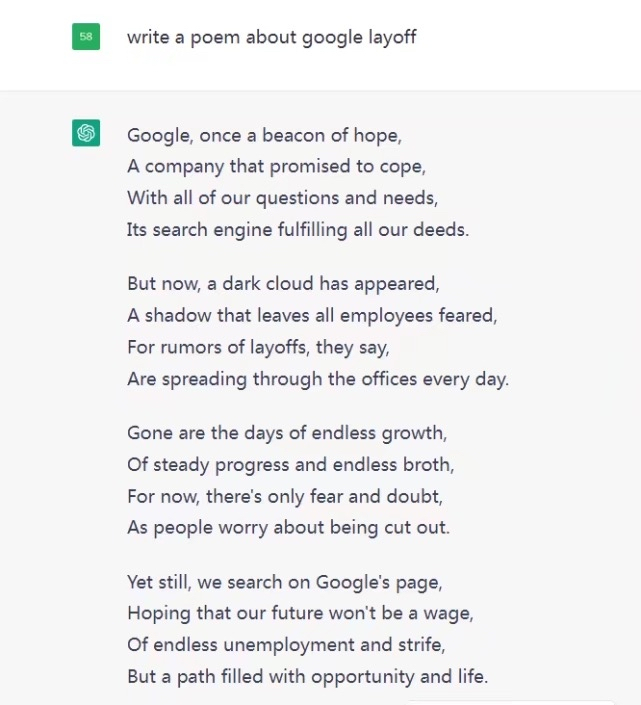 严峻的形式让一向引领 AI 方向的谷歌也不得不跟进。对此,谷歌员工还让 ChatGPT 写了一首有关谷歌裁员的诗: