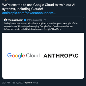 谷歌似乎复制了微软和 OpenAI 之间的合作关系。在原版那里,OpenAI 提供了研究专业知识,而微软不仅提供了数十亿美元的投资,还提供了庞大的云平台访问权 —— 这是训练最新的计算密集型 AI 模型所必需的。