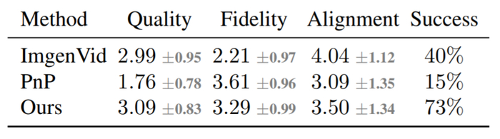 除了定性分析外,该研究还进行了基线比较,主要是将 Dreamix 与 Imagen-Video、 Plug-and-Play (PnP) 两种基线方法进行对比。下表为评分结果: