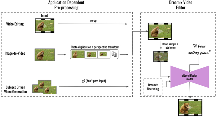 在应用程序预处理的基础上(Aapplication Dependent Pre-processing,下图左),该研究支持多种应用,能将输入内容转换为统一的视频格式。对于图像到视频,输入图像被复制并被变换,合成带有一些相机运动的粗略视频;对于目标驱动视频生成,其输入被省略,单独进行微调以维持保真度。然后使用 Dreamix Video Editor(右)编辑这个粗糙的视频:即前面讲到的,首先通过下采样破坏视频,添加噪声。然后应用微调的文本引导视频扩散模型,将视频升级到最终的时间空间分辨率。