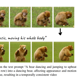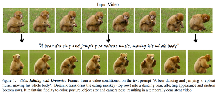 视频编辑:下图中 Dreamix 将动作改为舞蹈,并且外观由猴子变为熊,但视频中主体的基本属性没有变:
