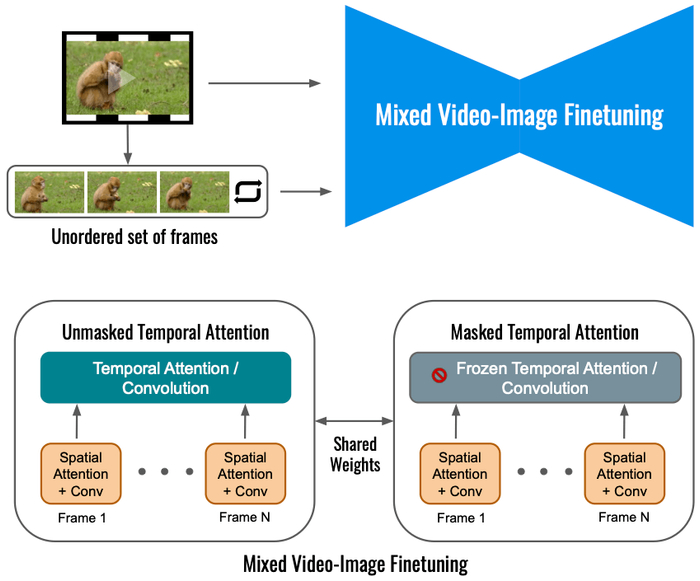 仅利用输入视频进行视频扩散模型的微调会限制物体运动变化,相反,该研究使用了一种混合目标,即除了原始目标(左下角)之外,本文还对无序的帧集进行了微调,这是通过「masked temporal attention」来完成的,以防止时间注意力和卷积被微调(右下)。这种操作允许向静态视频中添加运动。
