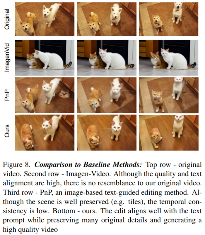 可以看到,视频编辑比图像编辑更加具有挑战性,它需要合成新的动作,而不仅仅是修改视觉外观。此外还需要保持时间上的一致性。因此,将 SDEdit、Prompt-to-Prompt 等图像级别的编辑方法应用于视频帧上不足以实现很好的效果。