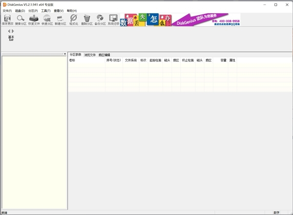 例如大名鼎鼎的磁盘工具DiskGenius,它不仅是个强大的磁盘分区工具,更附带数据恢复功能,例如工具栏中就有“恢复文件”的图标。只是有时候它面对RAW格式的磁盘也会无能为力,甚至会出现所有功能都不可用的“假死”状态。