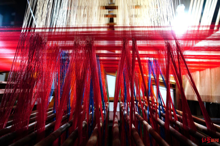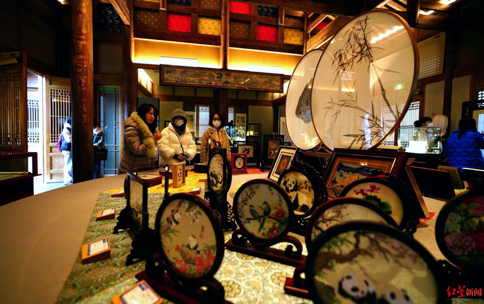 “走进官塘,就走进了中国非遗传统文化艺术的世界。”游客黄晓轩是第一次来天府新区官塘,在这里有一个非遗传承人集群,面塑、根雕、竹编、荥经窑、织锦等非遗铸匠云集。在用蜀锦装点的博物馆,墙面、房梁、摆件上,精美的蜀锦随处可见。方寸之间,匠人用一针一丝织就的人物、花鸟惟妙惟肖,山水绵纹细腻生动。