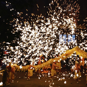 让游客们最惊奇的,是绽放在黄龙溪夜空的铁花。起源于东汉时期的“烧火龙”是黄龙溪古镇的传统民俗,素有“民间焰火之最”“中原文化奇葩”的美誉,2008年被列入“中国非物质文化遗产”。只见舞台上,火花在龙身、人身上蹦跳出一片火的海洋、一簇光的幻影。当匠夫把铁水舀起,抛向空中、用力击打,鲜红滚烫的铁汁、绚丽无比的铁花,在天空星星点点,如丝绦万缕,飘荡夜空,璀璨夺目。