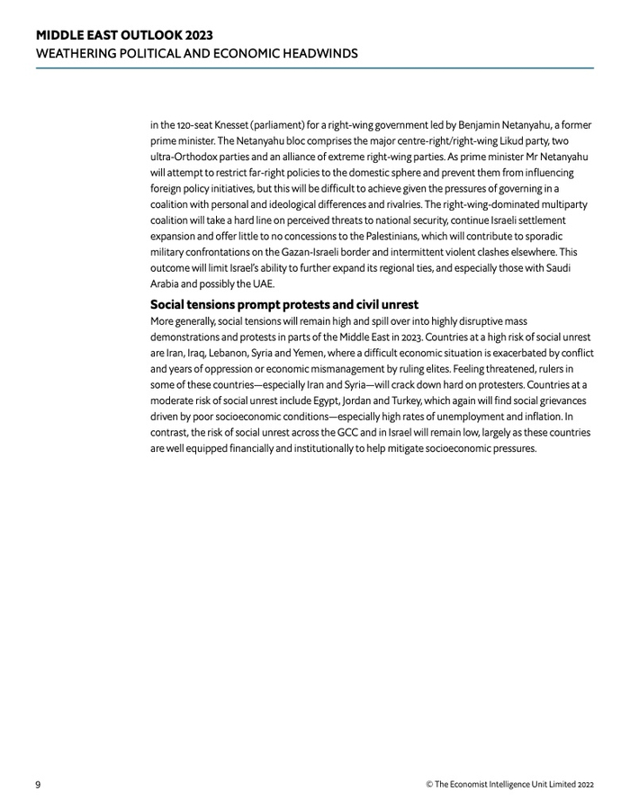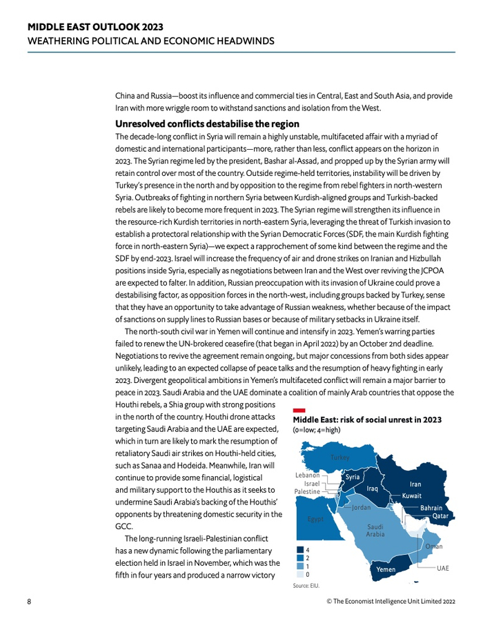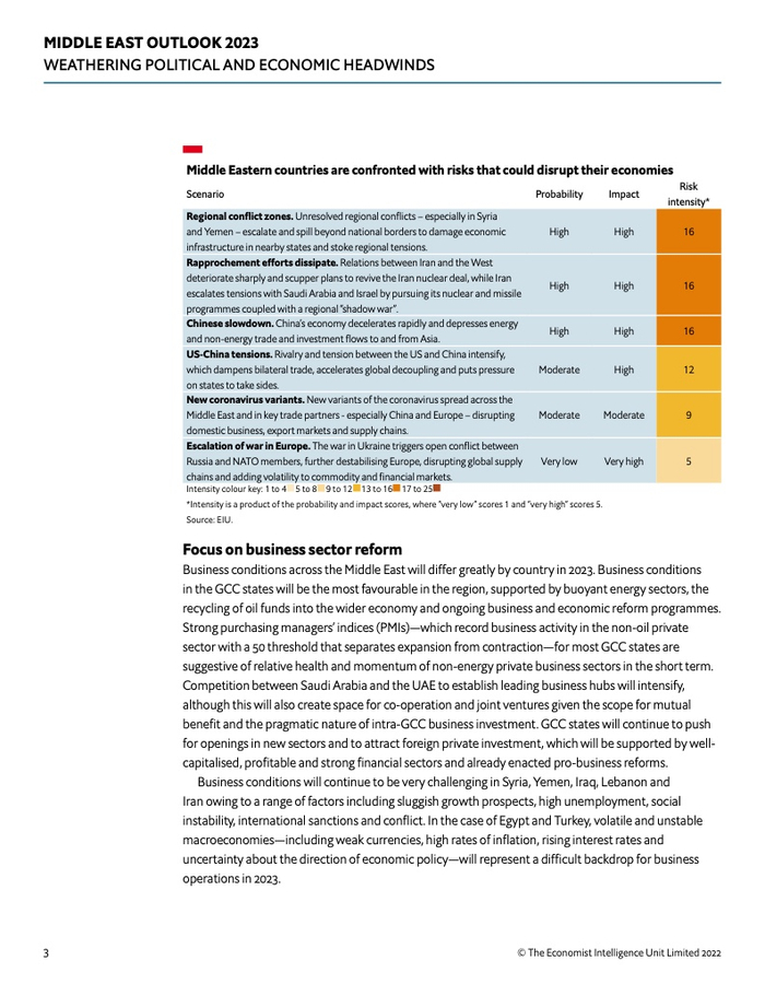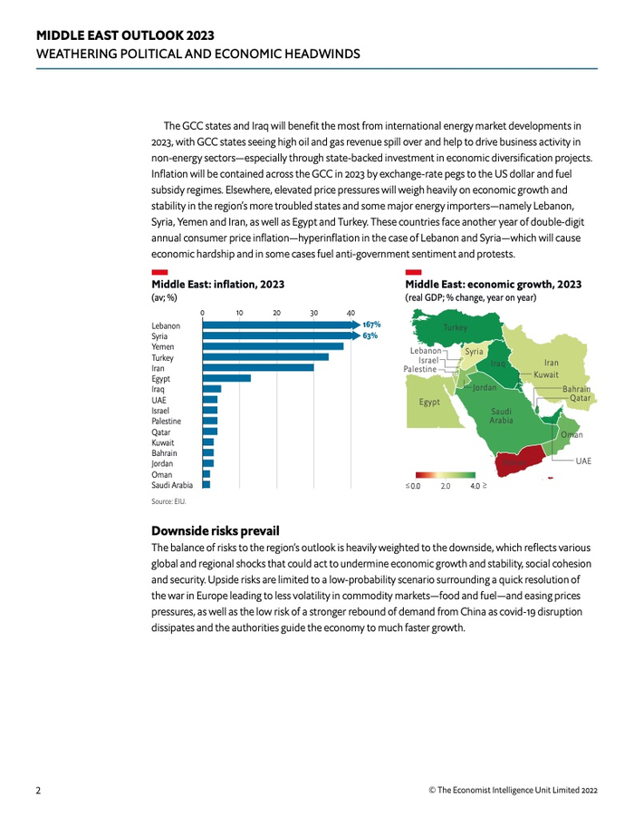 由于增长前景低迷、失业率高企、社会动荡、国际制裁、冲突等一系列原因,叙利亚、也门、伊拉克、黎巴嫩和伊朗的商业环境仍将充满挑战。在埃及和土耳其,动荡不安的宏观经济环境——包括疲软的货币、居高不下的通胀、持续上升的利率以及充满不确定性的经济政策走向——将为2023年商业运营埋下艰难的注脚。