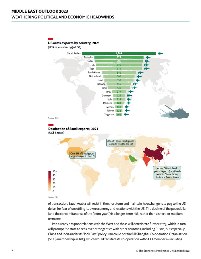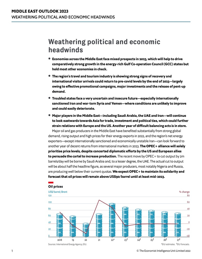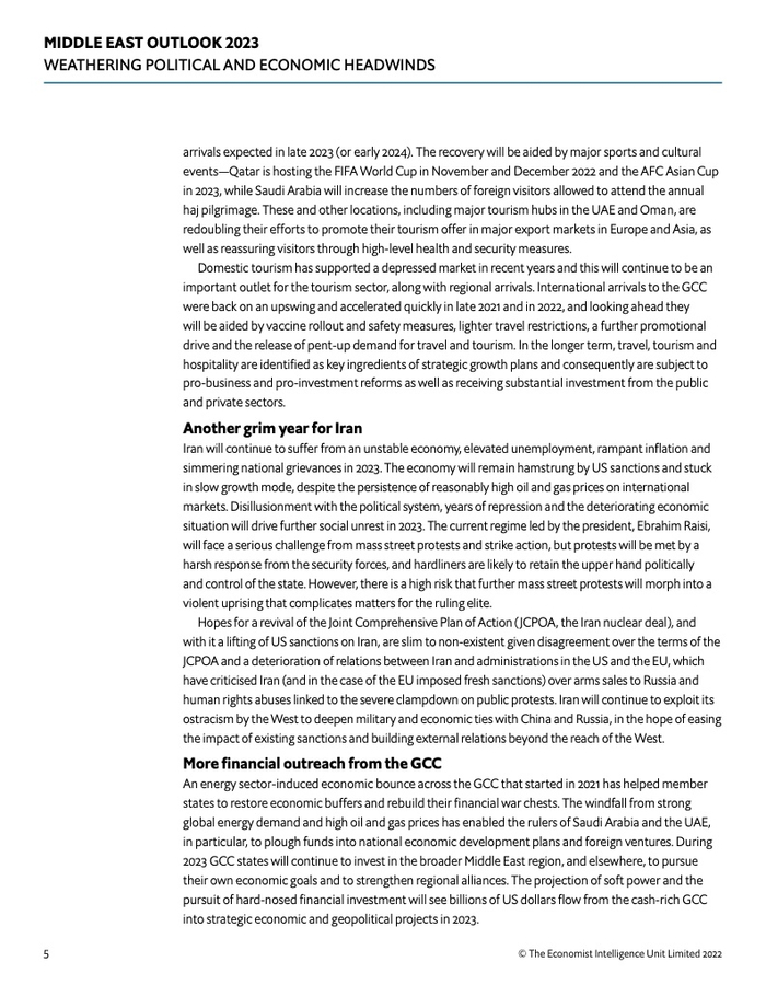 2023年,中东各国的经济前景喜忧参半。油气资源丰富的海合会(GCC)成员国将迎来相对强劲的增长,但其他多数经济体则是前景未明。中东地区的旅游业正显露出强劲的复苏迹象。到2023年底,得益于行之有效的推广活动、重大投资项目的落地以及积压的需求得到释放,国际旅客人数有望恢复到疫情之前的水平。然而,深陷困境的国家将面临不确定性和不稳定因素,尤其是受到国际制裁的伊朗以及饱受战争蹂躏的叙利亚和也门。这些国家的情况不太可能得到改观,而且极易恶化。包括沙特阿拉伯、阿联酋和伊朗在内的中东大国继续将目光投向亚洲,以谋求深化贸易、投资和政治合作。此举可能会进一步加深与欧美的紧张关系。2023年,在各国之间维系平衡将变得艰难。