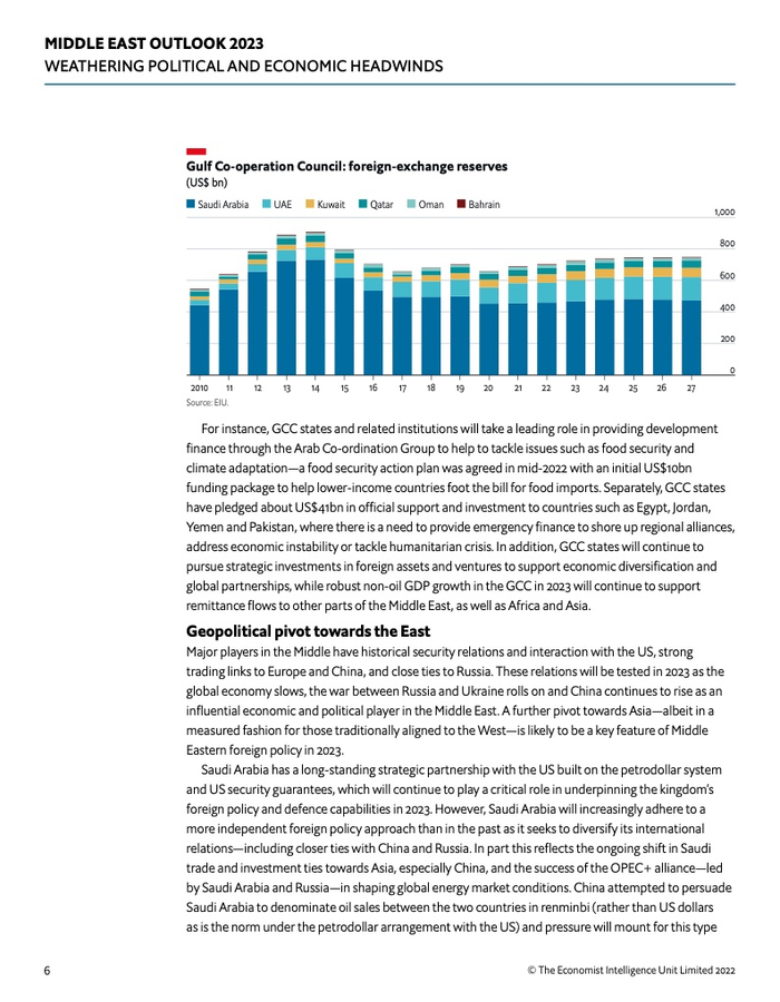 从2021年开始,能源产业的繁荣带动了海合会各成员国的经济反弹,帮助成员国恢复了经济缓冲能力并重新积累了雄厚的财力。全球能源需求强劲加之油气价格高涨所带来的“意外之财”令沙特阿拉伯和阿联酋政府有充足的资金投资于本国的经济发展计划以及各种海外商业项目。在2023年期间,海合会成员国将扩大中东地区的投资范围并在其他地区同时展开投资,力争实现各自的经济目标,并着力巩固区域联盟。2023年,预计将有数十亿美元的资金会从现金流充裕的海合会成员国流向各种战略性经济和地缘政治项目,用于“软实力”展示和各种务实财务投资。