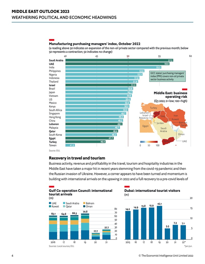 中东各国2023年的商业环境各异。得益于能源行业的繁荣、石油收入向更广泛经济领域的外溢,以及稳步推进的各项商业和经济改革计划,海合会成员国将坐拥中东地区首屈一指的商业环境。在大多数海合会成员国,强劲的采购经理人指数(简称PMI,记录非石油私营部门的各项商业活动,并将50列为荣枯分界线)预示了非能源私营部门在短期内相对健康良好的发展势头。在打造领先商业中心方面,沙特阿拉伯与阿联酋之间的竞争将会愈发激烈。不过,在一些互惠互利的领域,两国仍有较大的合作与合资空间。海合会成员国将继续开放各种新兴行业并大力吸引外国私人投资,而各成员国资本充盈、盈利能力较强的金融行业以及一系列已在推行的亲商型改革将为此类投资提供有力的支撑。