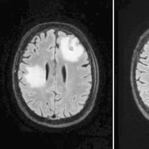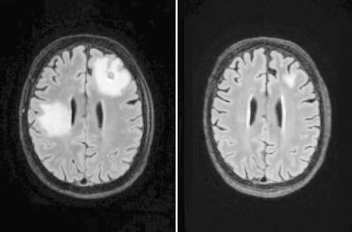 MRI显示,一名脑部感染巴氏阿米巴原虫的男子在接受实验药物治疗前(左)后炎症(白色部分)存在显著差异。
