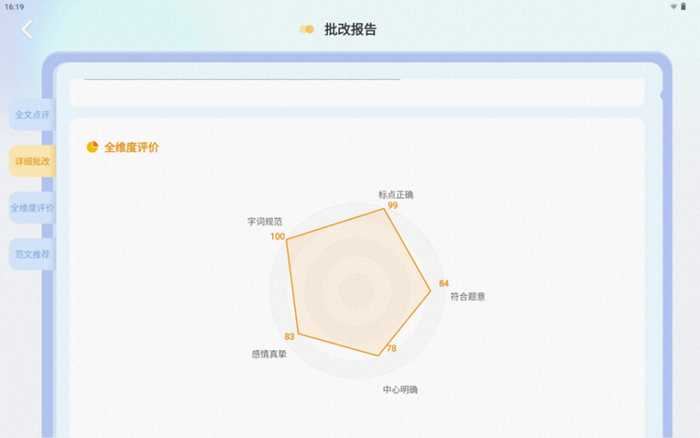在辅导写作题型时,写作前,学习机可提供写作指导思路,同步作文写作指导和范文;写作后,通过中高考同源批改技术,从内容、表达、 文采三个方面进行整体评价;基于孩子写作的薄弱维度,推荐相关的范文、好词好句等,助力写作水平的提升。