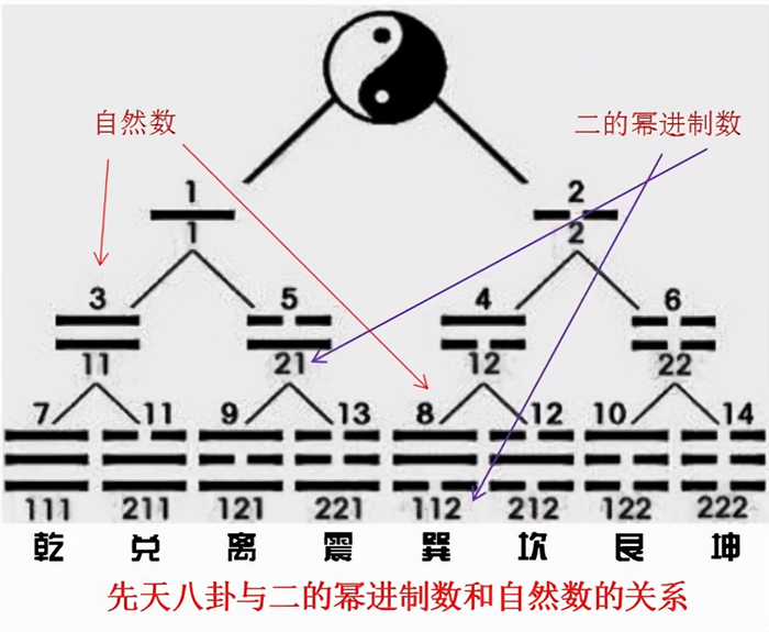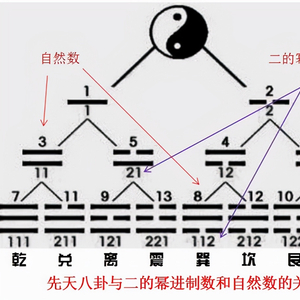 于是就出现了伏羲“一画开天”的神话故事。传说伏羲经常盘坐卦台山巅,苦思宇宙的奥妙,仰观日月星斗的变化,俯察山川景物的规律,不时地反省本人,追年逐月,风雨无阻。或许是感动上天,或许是自己想的太入迷,他好像是看见了一副非常美好的画面,于是伏羲忽然心有所感,太极神图深切映入他的认识之中,他顿时眼光如炬,彻底洞穿了天人合一的密码。原来天地竟是如此的简单明了,“上天”创建宇宙的源头里居然只有一个数字,然后伏羲抑制住内心的狂喜,静下心继续观察从源头宇宙到物理宇宙过程里的宇宙状态的变化,伏羲发现“上天”并不是直接使用“1”创建宇宙的,而是先采用“1”创建出“1、2、0”三个数字后,再创建万物的,于是伏羲采用先天八卦的图形符号形式对这个规则进行了描述。1采用“–”代替,表示“阳”;2用“- -”代替,表示“阴”,0用旋转的“圆形状态”代替,表示“逻辑的开始和结束”。 如果把伏羲的描述采用现代科学的术语进行转换,那么一画开天就是“二进制”规则,而先天八卦就是二的幂进制规则。