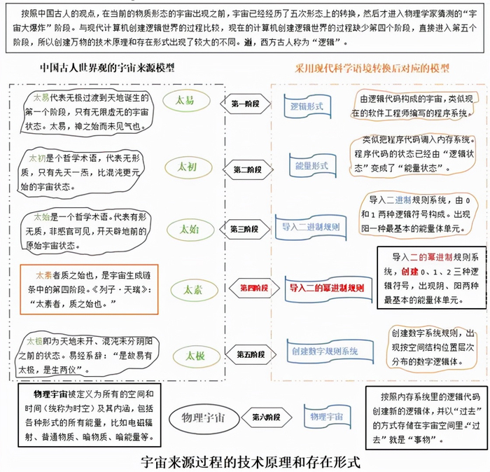 如果分析中国古人创建的关于宇宙来源过程的技术原理模型,当前的物理宇宙出现之前,经历了五个阶段的宇宙状态的转换。如果把这个模型采用现代科学的语境进行转换,就可以发现现在的人类创建的”信息宇宙“基本上也经历了类似的宇宙状态转换的过程,只是缺少第四个阶段的宇宙状态转换过程。也就是直接从第三个阶段的二进制规则宇宙状态进入到第五个阶段,然后就进入第六个阶段,创建”信息宇宙“的大爆炸模型阶段。