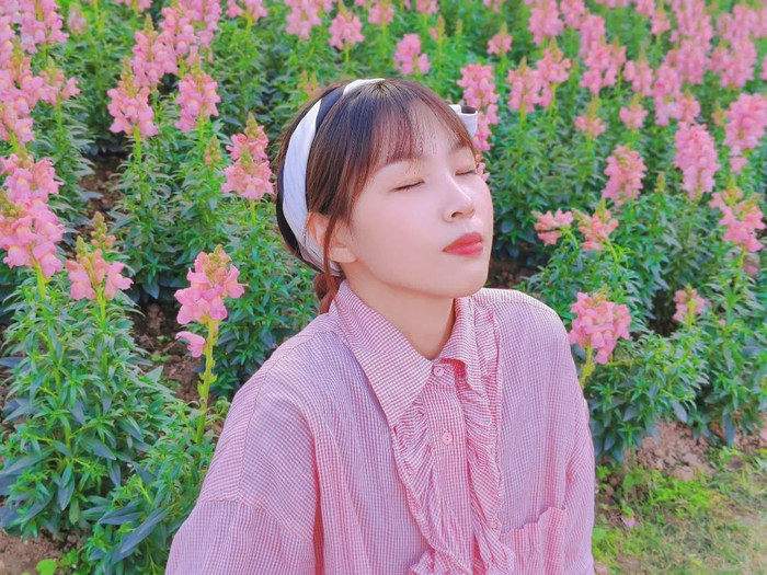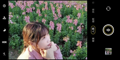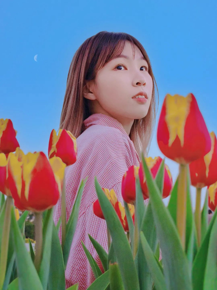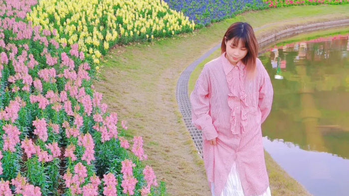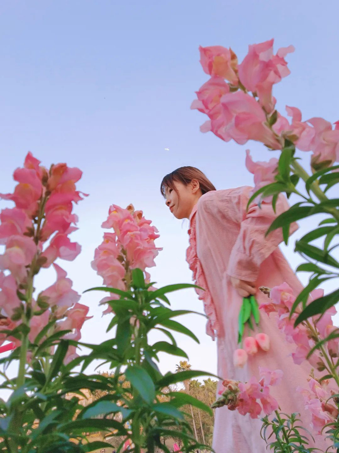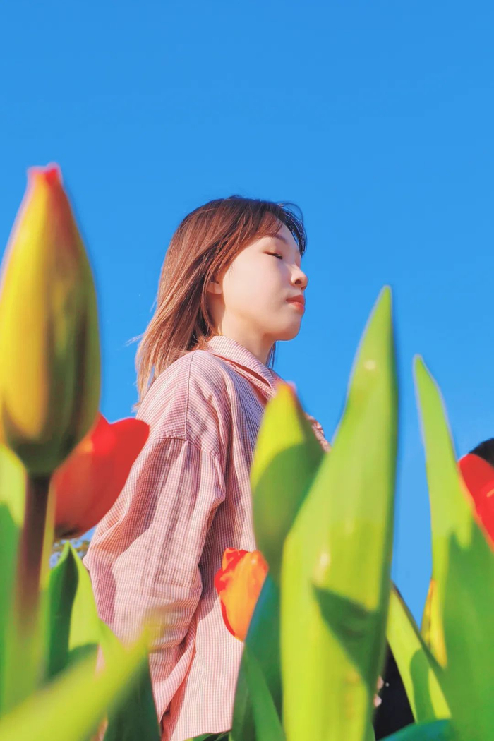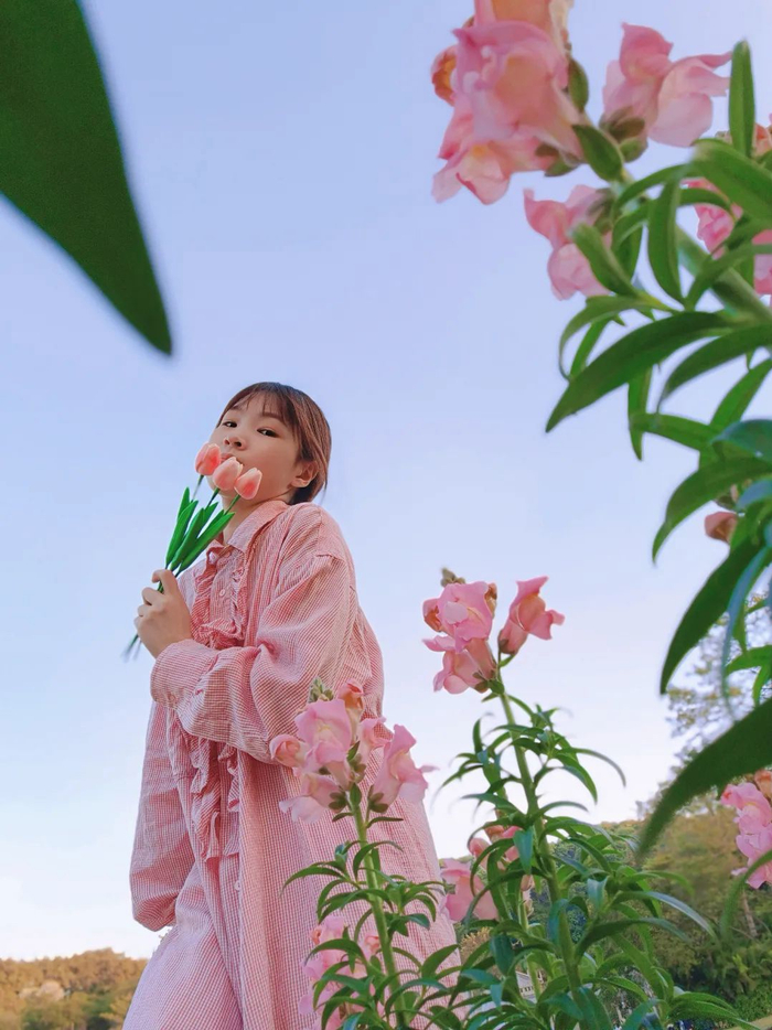 首先,打开相机的前置镜头,然后将手机放在花丛中的缝隙下,以蓝天为背景 45° 仰拍,人物错位站在花丛间的空白区域,或假装经过或看镜头摆 pose。