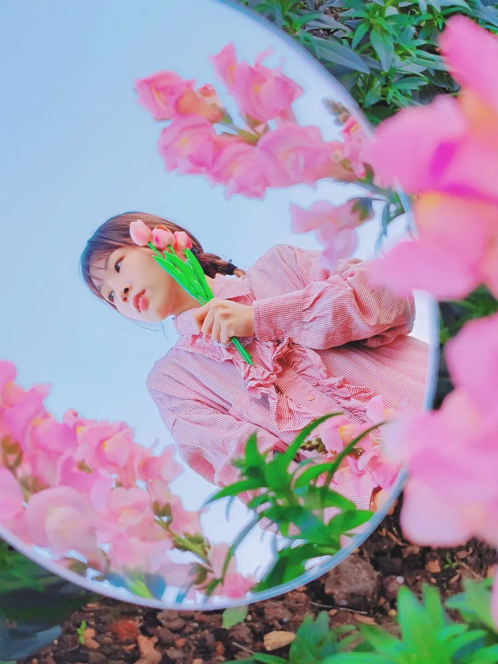 我们可以将镜子放在地上或者花丛中,寻找镜子折射出花卉、人物、蓝天的画面然后拍摄,镜子画面要尽可能简洁。