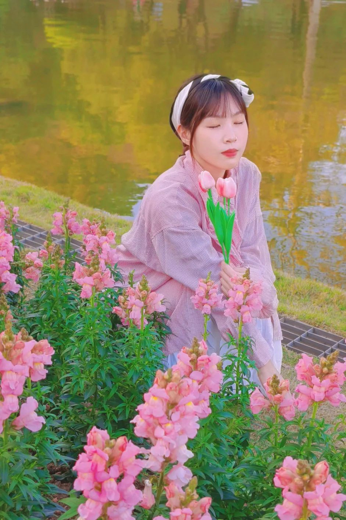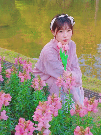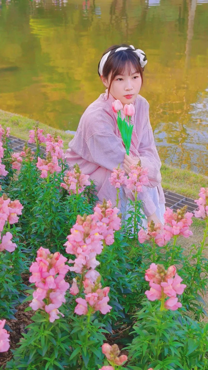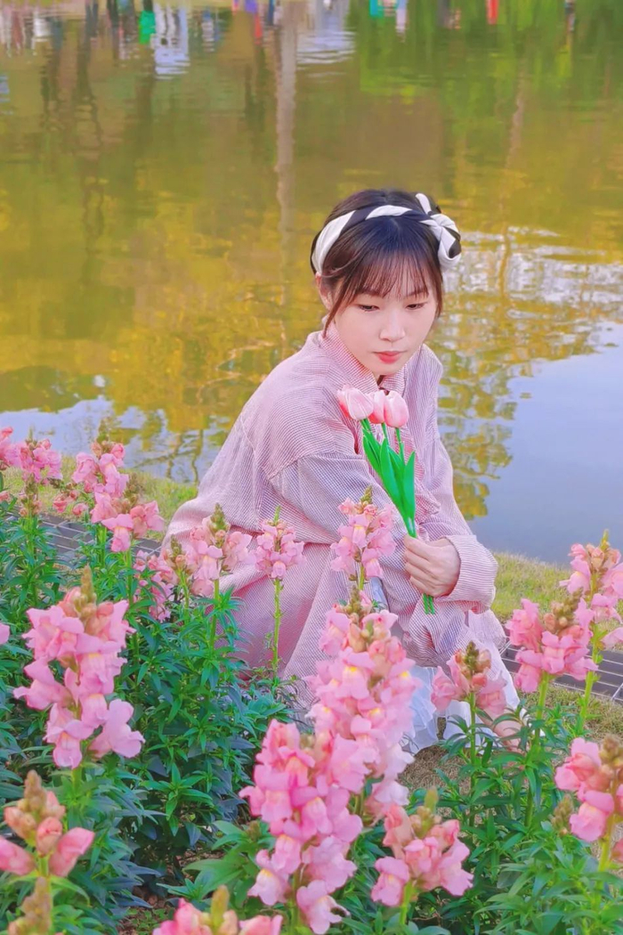 有些花卉会种在湖边,如果条件允许的话,模特可以手拿一束花蹲坐在湖边,或看风景或闭目感受。(注意安全哦~)