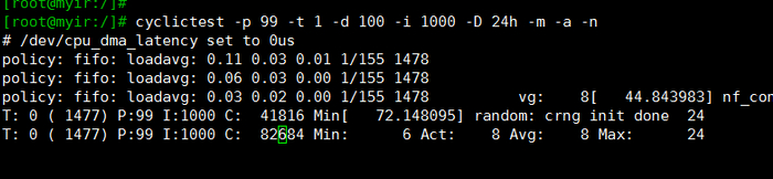 cyclictest -p 99 -t 1 -d 100 -i 1000 -D 24h -m -a -n