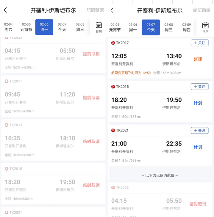 据时代财经查询航班管家,相比2月6日大面积取消的航班,2月7日,从卡帕多奇亚的开塞利埃尔基莱特国际机场以及内夫谢希尔卡帕多奇亚机场飞往伊斯坦布尔的航班已陆续恢复。