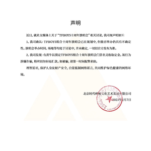 据新闻晨报,2月7日,峰峻文化发布声明,回应近日网上的“TFBOYS十周年演唱会”的讨论,“我司确认:TFBOYS组合十周年演唱会已在规划中,但能否举办仍具有不确定性。演唱会举办时间、场地等均处于讨论中,并未确定,一切以官方发布为准。”