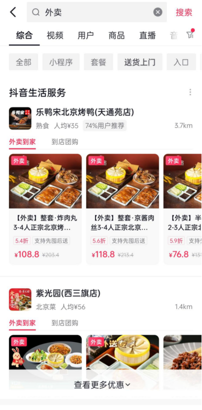 新浪财经在抖音上看到,如果搜索外卖,会出现抖音生活服务的相关推荐,在餐饮门店下有外卖到家和到店团购两个选项。