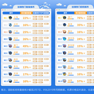 根据携程数据,2月出境机票热门始发城市Top10为上海、北京、广州、杭州、厦门、成都、南京、青岛、天津、深圳。从统计到的已恢复周均航班来看,目前,热门城市较2019年平均国际航班恢复量为24%,其中厦门国际航班量较2019年恢复度最高,为49%。