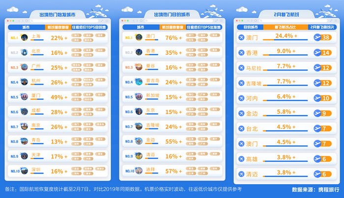 据携程统计,截至本周一,二月国内出境复飞航线已超过48条,复飞周均航班量已超过156班,复飞航班量前十均为亚洲地区城市,分别为:曼谷、香港、马尼拉、吉隆坡、河内、金边、台北、澳门、高雄、清迈。