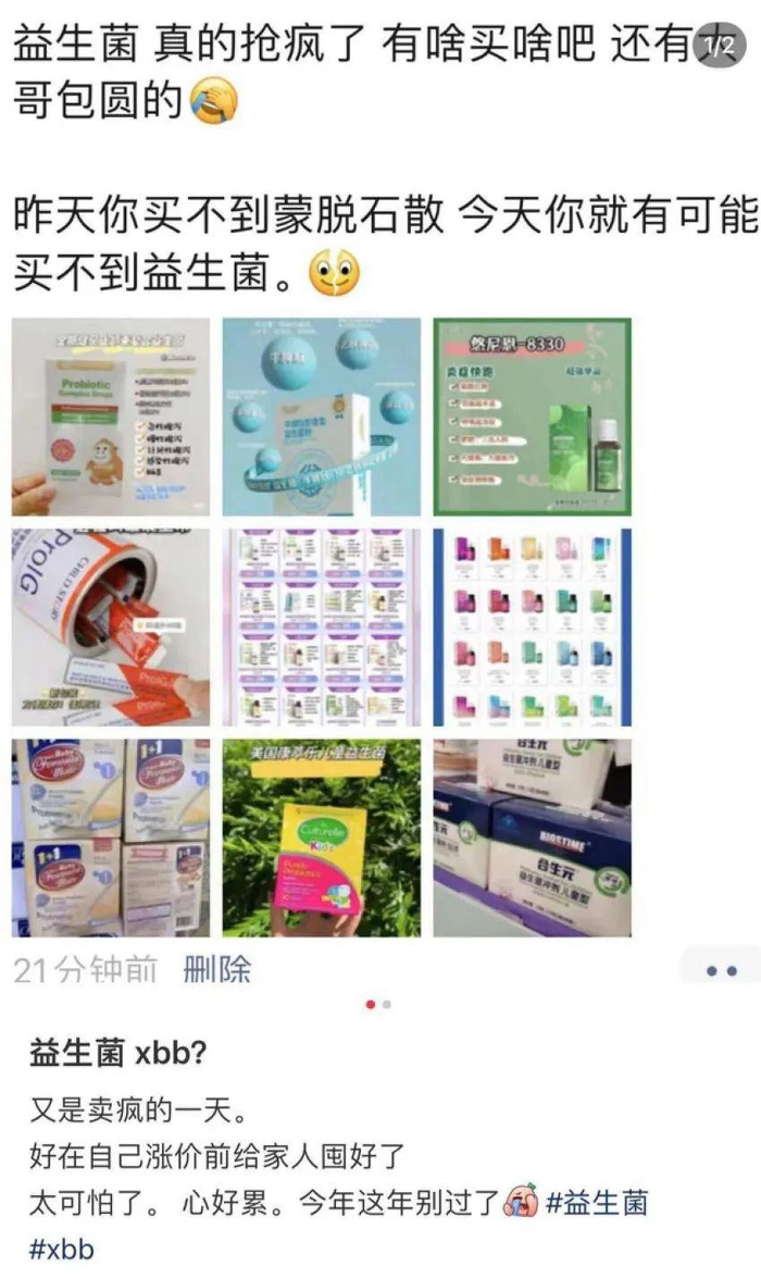 无独有偶,益生菌也是在有人传出XBB毒株症状后开始走俏,小红书上有人放出了朋友圈卖营养保健品人的截图,毫无疑问,他们在话术上利用了人们从众、怕断货的心态——“有啥就买啥吧”“昨天你买不到蒙脱石散,今天你就有可能买不到益生菌”。
