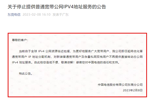 中国电信东莞宣布:停止提供普通宽带公网IPV4地址服务