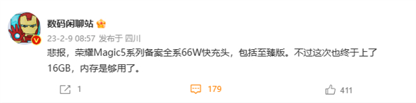 博主“数码闲聊站”今日透露,荣耀Magic5系列将全系配备66W快充,包括至臻版。