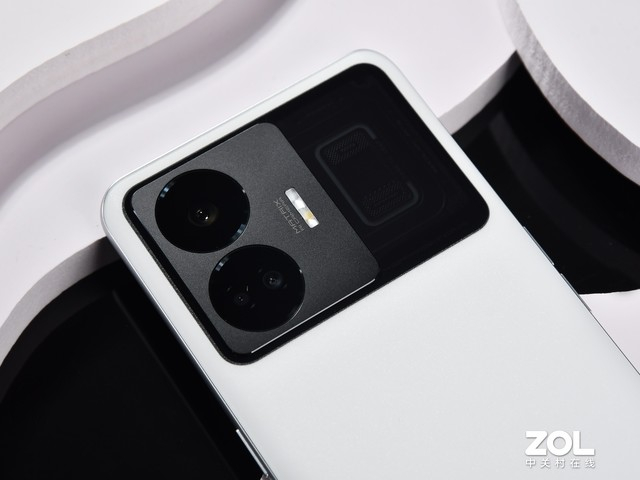镜头模组部分由金属摄像头DECO及全透明性能结构设计共同组成。其中透明区域犹如在机身上开了一扇窗,将内部真实结构展示出来。并且在居中位置还专门定制了不锈钢芯片铭牌,在光线下透露出与众不同的金属光泽。为了让这一扇窗更加透明,真我GT Neo5采用行业首创的透明双膜零躁点工艺,确保透明区域没有噪点,没有镀层残留、多余颗粒,使机身背部完美呈现出分层视觉效果。