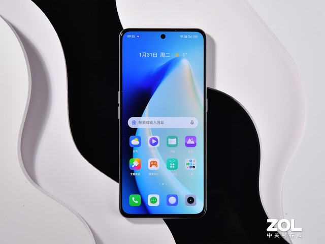 说完了背面,咱们翻过来看看真我GT Neo5的正面,这里它搭载了一块6.74英寸AMOLED柔性直屏,采用当下流行的2772*1240定制1.5K分辨率。关于这块屏幕可聊的属实不少。首先得益于新一代COP封装工艺的加入,真我GT Neo5的屏占比高达93.69%,下巴宽度也达到了2.31mm的超窄水平,带来更加出色的全面屏观感。