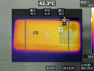 可以看到在运行半小时后,机身平均温度为41.9摄氏度。整个游戏过程中机身发热处于可接受水平,如果关闭GT模式机身温度还会进一步降低。