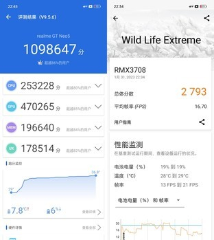 作为“潮玩电竞旗舰”,真我GT Neo5在性能方面自然也不会落下,骁龙8+处理器搭配LPDDR5X内存以及增强版UFS 3.1闪存,整体配置在当下的手机市场仍然算得上是第一梯队。为了验证其性能表现,我们首先请出评测编辑们的“好朋友”安兔兔和3D Mark,对这款手机进行跑分测试。可以看到,安兔兔成绩达到了1098647分,3D Mark成绩达到2793分,表现十分出色。