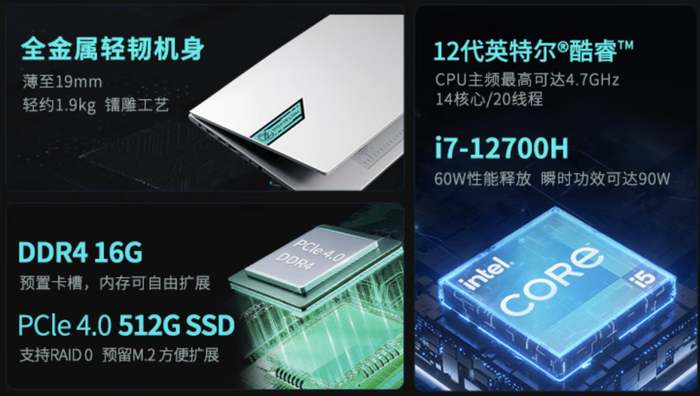 i7-12700H 采用了性能核 + 效能核新异构核心,拥有 14 核 20 线程,综合性能对比上一代提升高达 220%。