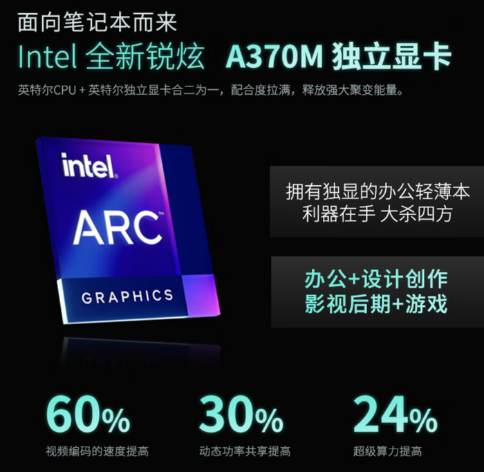 显卡方面则是英特尔最新的锐炫 A370M 独显,参数方面,锐炫 A370M 搭载了英特尔 ACM-G11 GPU 核心,拥有 1024 流处理器,配备 4GB 64bit 的 GDDR6 显存,功耗在 35 至 50W。