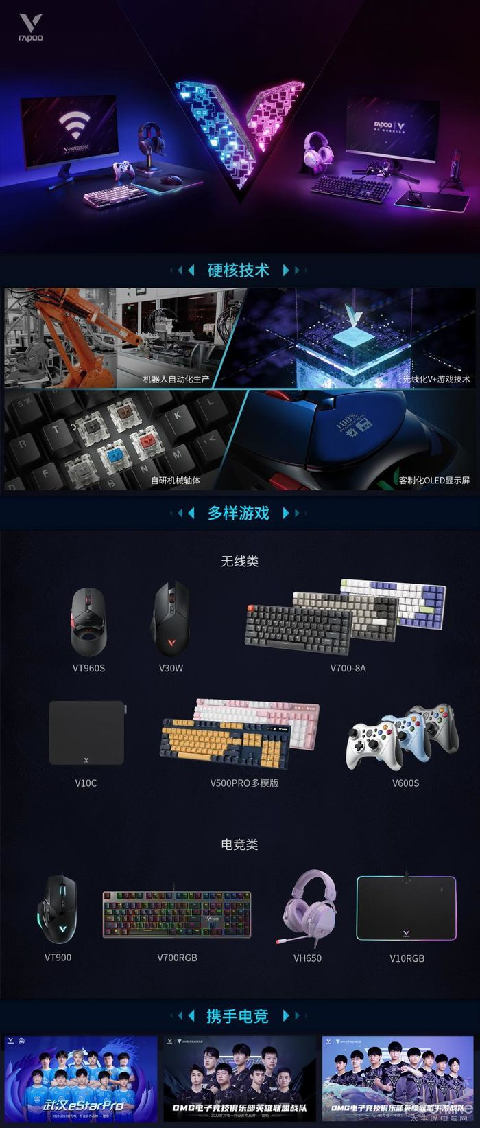 以技术研发为核心,以市场需求为指引,凭借雄厚的研发实力,自主研发定制雷柏轴体、雷柏微动、游戏芯片等核心产品部件。Qi无线充电、OLED显示屏、防水防尘、板载内存、云端存储等具有出色电竞表现的个性化功能解决玩家需求痛点。V+无线游戏技术提升优化续航、低延迟、抗干扰、使用距离,以全新战斗姿态探索电竞未来。