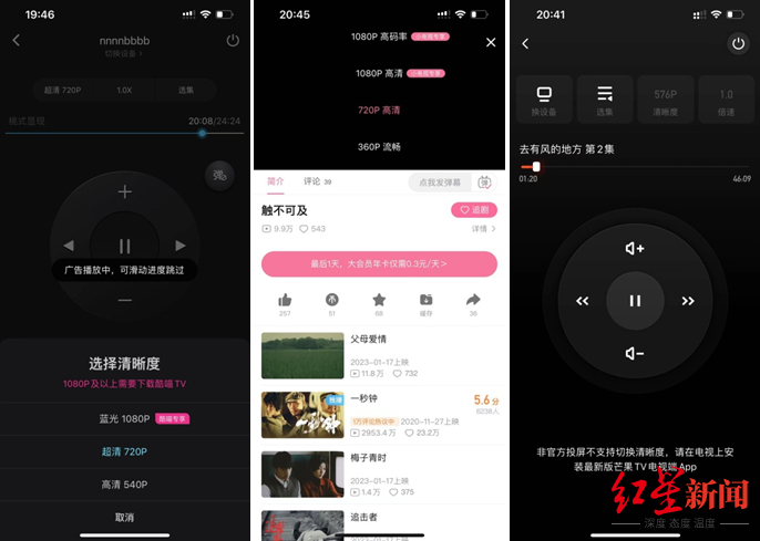 红星新闻记者通过实际操作发现,目前几乎所有的主流长视频App都对低级别会员有投屏清晰度限制。芒果TV普通会员仅支持576P清晰度投屏;优酷普通会员仅支持720P清晰度投屏,部分热门剧集则直接禁止投屏,只能试看6分钟;B站普通会员也仅支持720P清晰度投屏;腾讯普通会员最高支持1080P清晰度投屏。